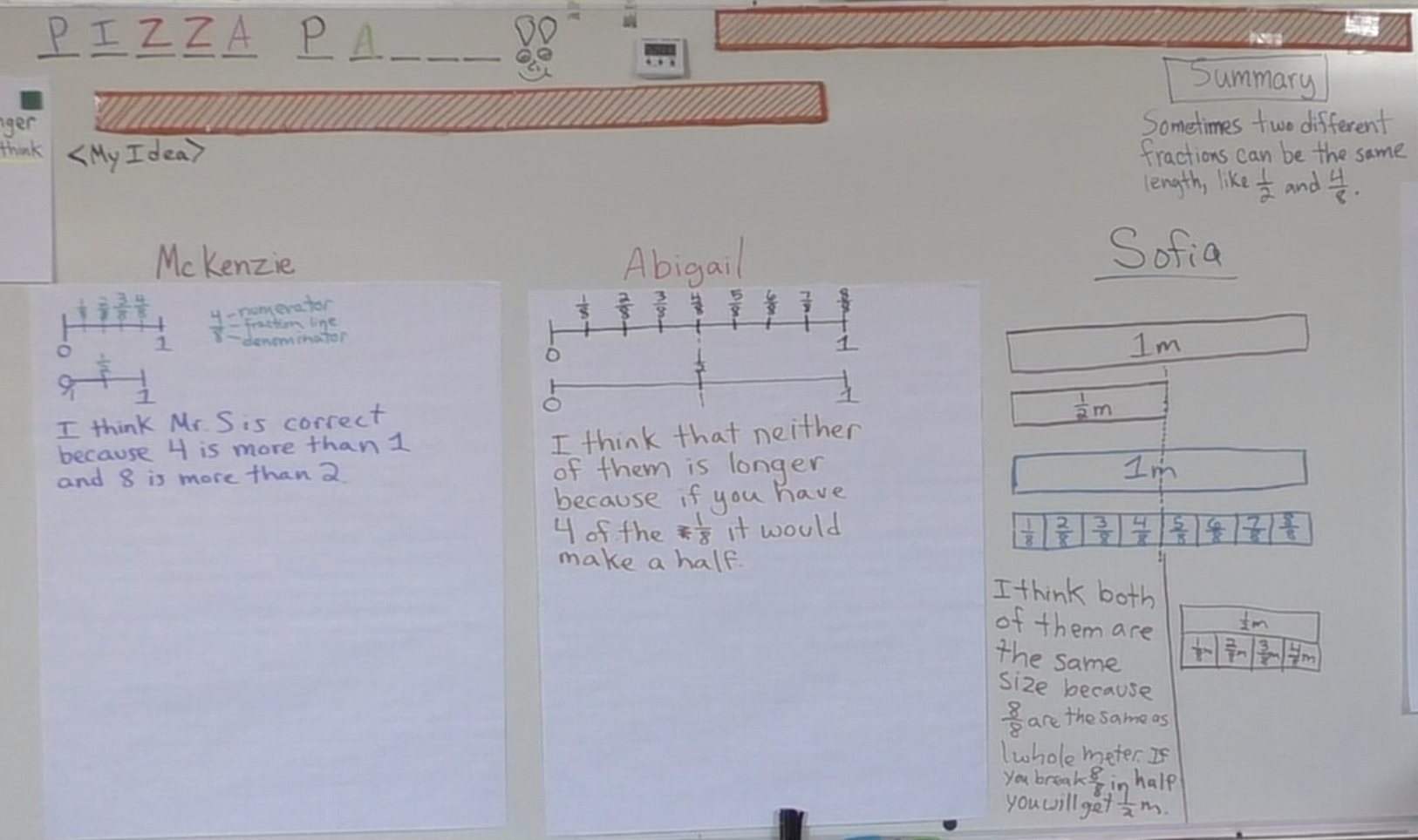 Teachers notice that some students created units of an arbitrary size and called it an “eighth” rather than dividing the whole in order to create accurate eighths. Teachers’ observations suggest that many students cannot explain why the two different approaches did not yield the same answer. The classroom teacher decides to begin the next day’s lesson by featuring these contrasting solution strategies and asking why the two students came to different conclusions.