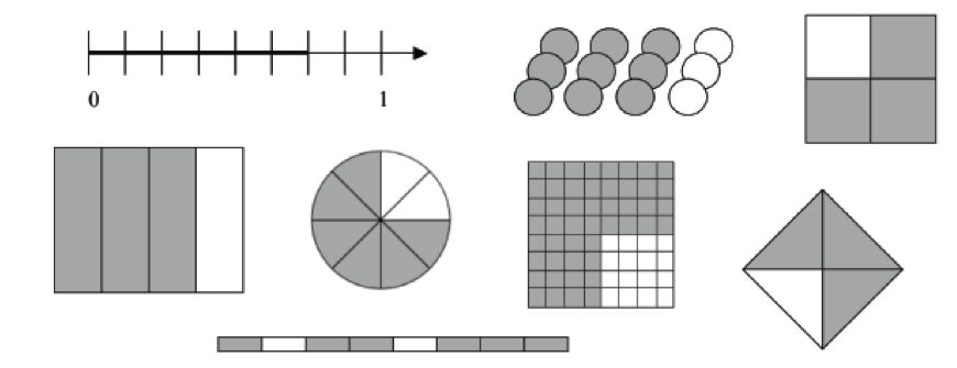 Students’ images of fractions are shaped by mathematics lessons and by real life experiences. What images of fractions do your students typically draw when asked to make sense of a fraction problem? The illustration below shows the fraction 3/4 shaded in eight different models.
