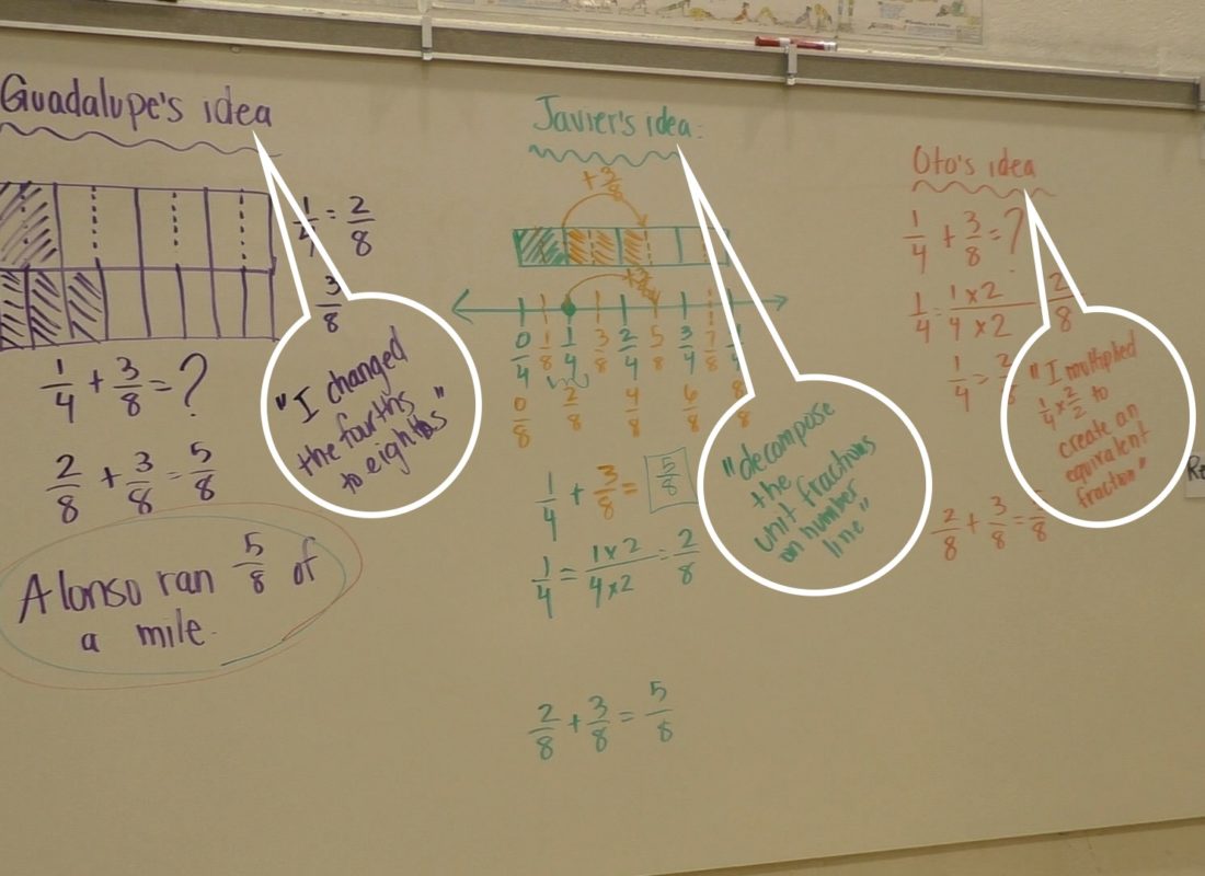 Confronted for the first time with a problem of adding fractions with unlike denominators, students noticed that the denominators differed and that it was addition (not comparison) of fractions, sparking the two key pieces of prior knowledge that would enable the students to develop (rather than be given) an addition procedure–their knowledge of fractions addition and equivalence.