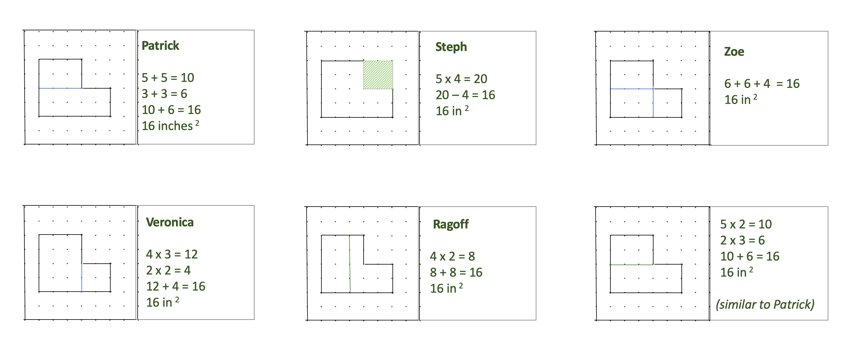 At the beginning of lesson 2, students read their written reflections sharing what they learned about finding the area of the L-shape.