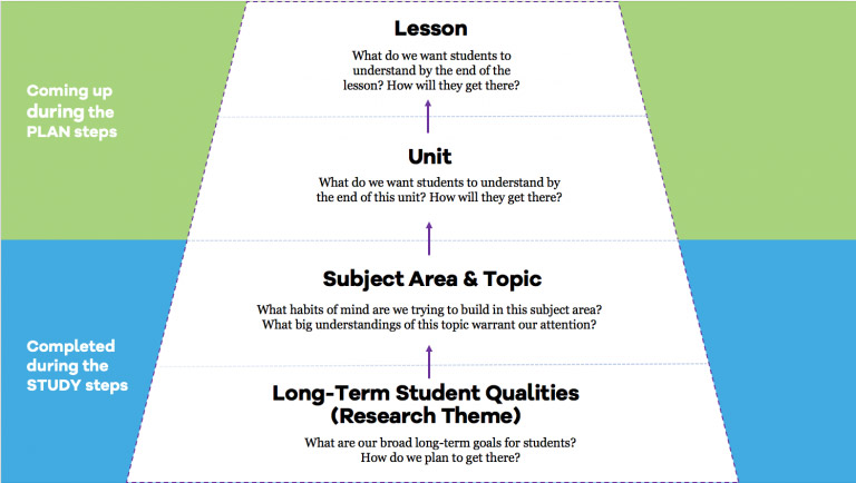 As shown in the graphic below, your team’s work to date–articulating your long-term goals and studying the topic–provides the foundation for the Plan phase. In the graphic below, you are now transitioning from the Study phase (blue) to the Plan phase (green).