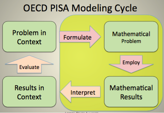 The following diagram from the Program for International Student Assessment (PISA) outlines the steps students go through when solving problems with real-world contexts, and may point to what we want to build in students as they are introduced to addition and subtraction story problems.